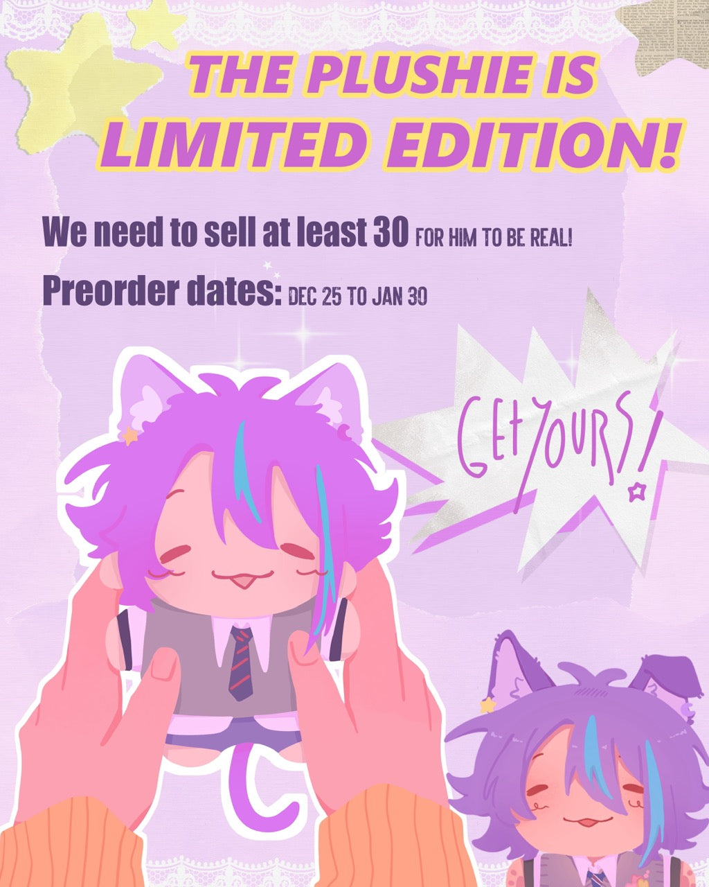 A goal of 30 orders is required for the plushie to be real!! If the goal is not met in time, full refunds will be made to every buyer Bulk production will take approximately 2-3 months before it is shipped