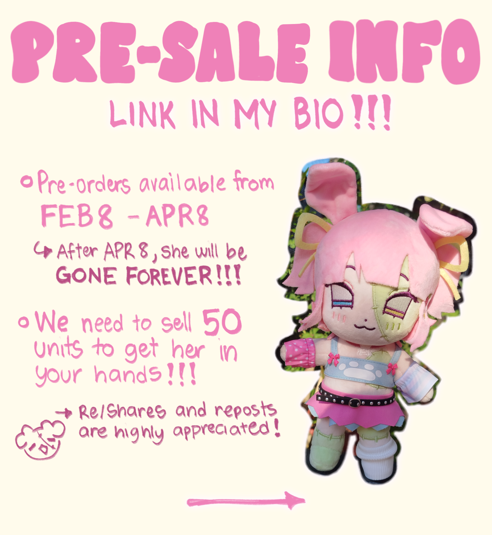 Once pre-sale ends, production will approximately take 2-3 months before shipping. These plushies are handmade, and take time. Please take this into account before buying!